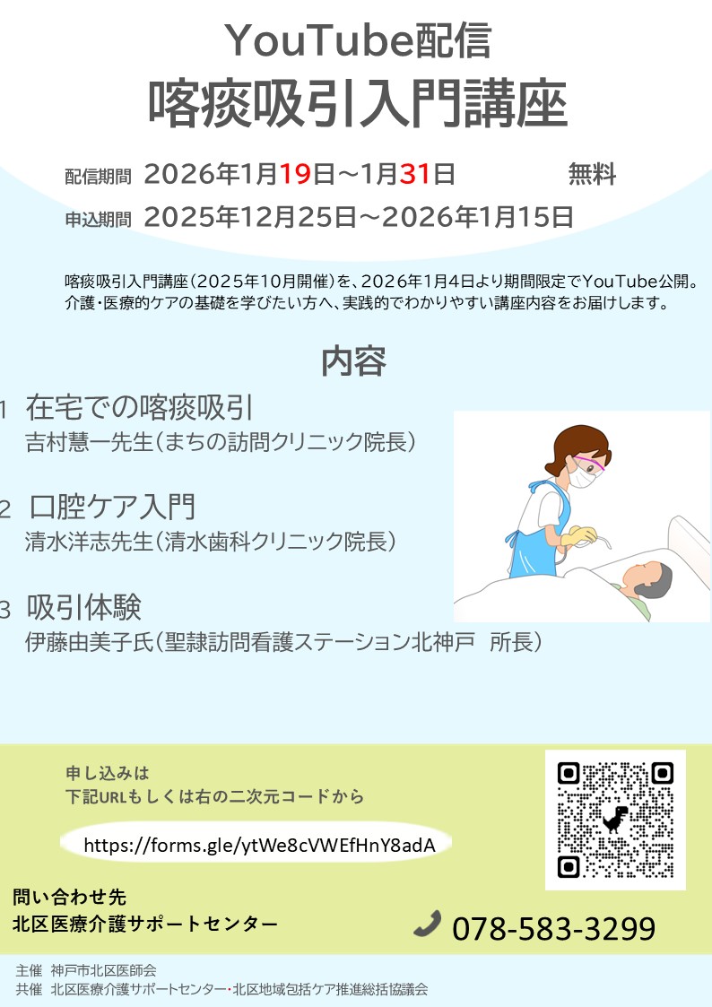 YouTube配信喀痰吸引入門講座配信期間 2026年1月19日~1月31日 無料 申込期間 2025...2025年12月25日掲載 -